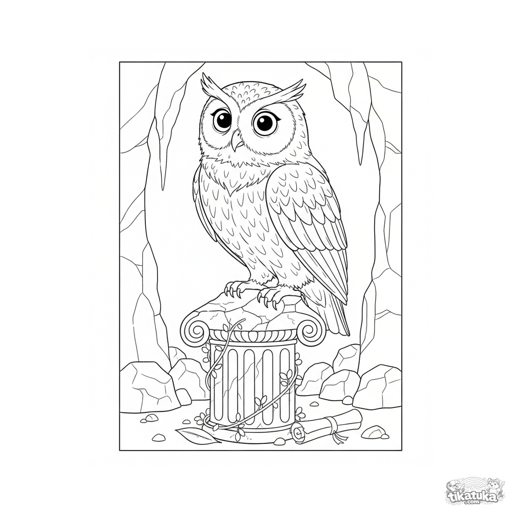 Раскраска для детей 10-12 лет: детализированное изображение священной совы богини Афины, сидящей на колонне в каменном логове Медузы. Реалистичный стиль.