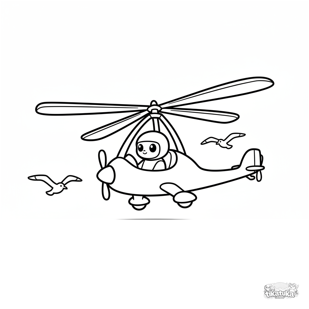 Раскраска для малышей 2-3 лет: необычный автожир с большим винтом летит над океаном. Очень крупные, четкие контуры, минимум деталей.