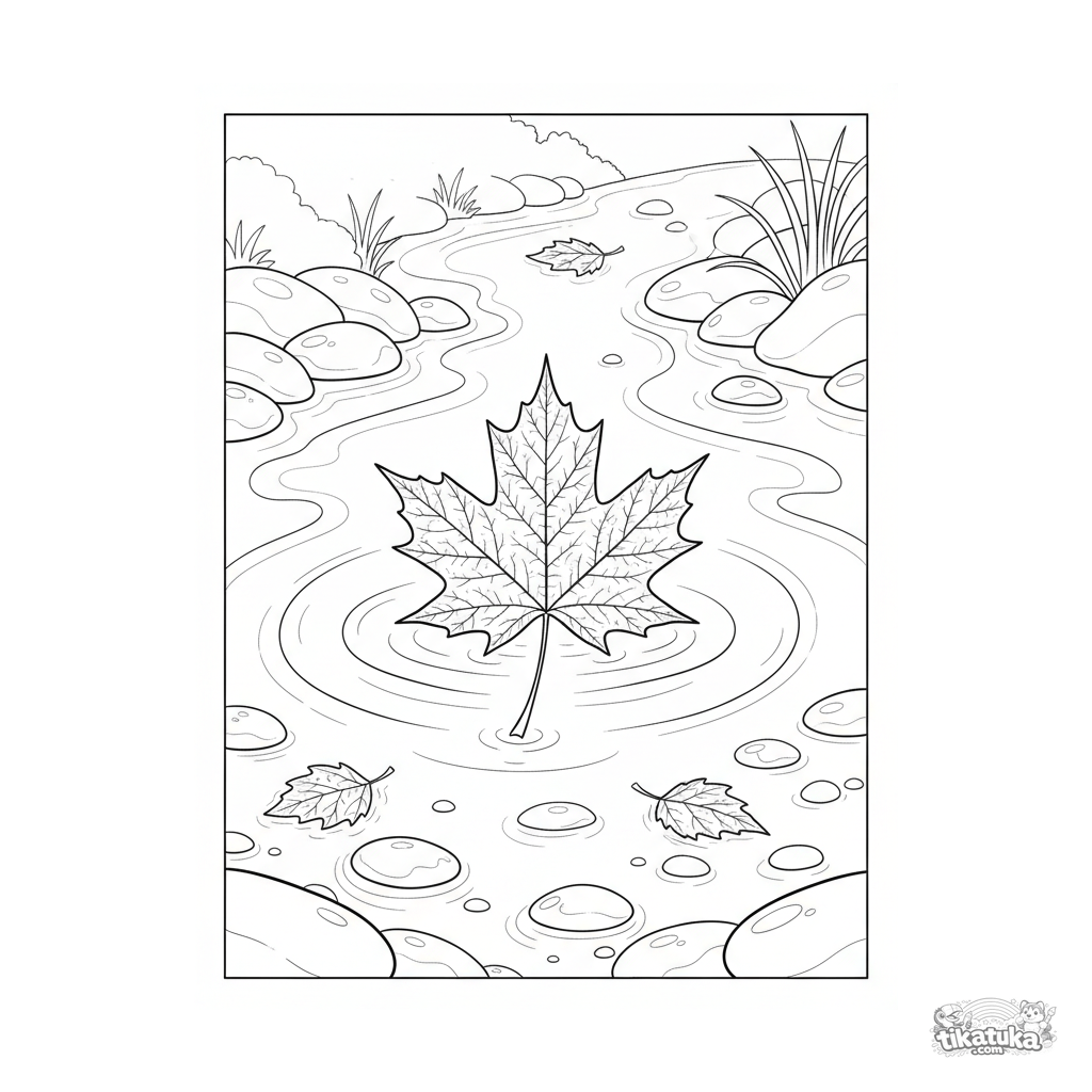 Раскраска для детей 7-9 лет: крупный кленовый лист с прожилками плывёт по течению прозрачного осеннего ручья. Детализированное изображение осенней природы.