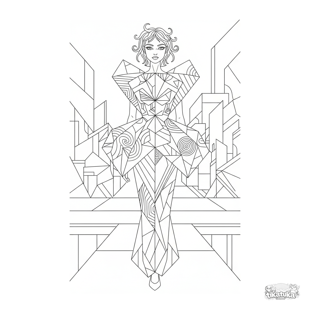 Сложная раскраска для девочек 10-12 лет: авангардное скульптурное платье из геометрических форм на подиуме. Абстрактный дизайн, минималистичная сцена.