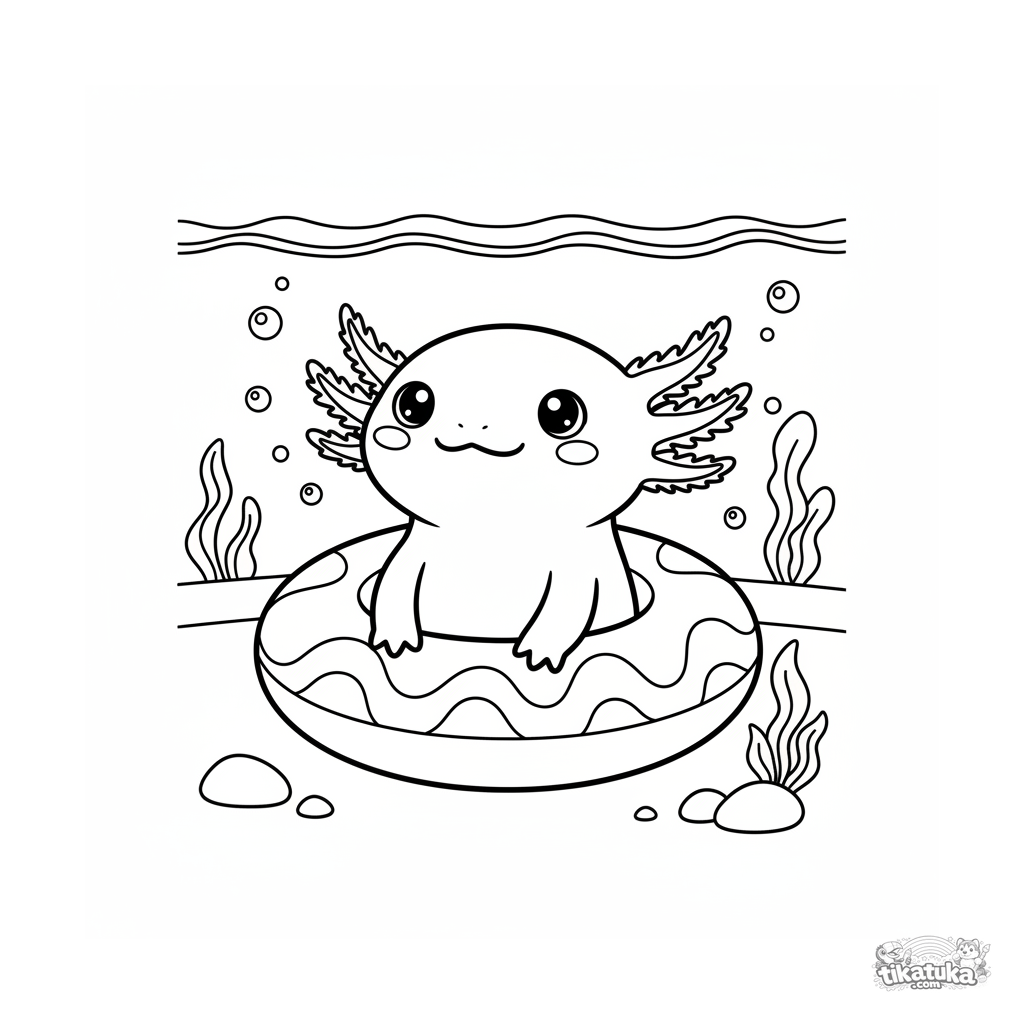 Раскраска для детей 4-6 лет: милый аксолотль сидит в надувном круге на дне бассейна, вокруг пузырьки. Простые формы, четкие контуры.