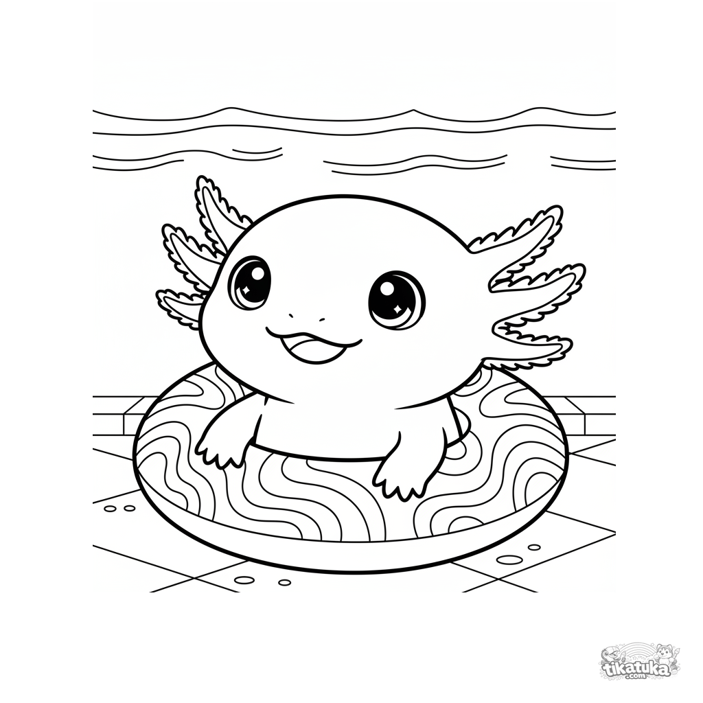 Раскраска с милым аксолотлем, сидящим в надувном круге на дне бассейна. Для детей 4-6 лет. Простые формы и милое выражение.