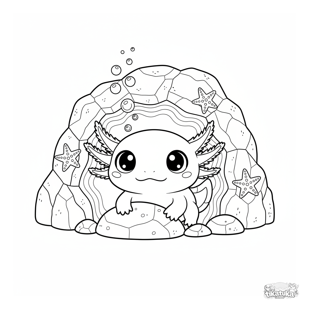 Сложная раскраска для детей 7-12 лет: любопытный аксолотль выглядывает из светящейся подводной пещеры среди пузырьков и морских звёзд.