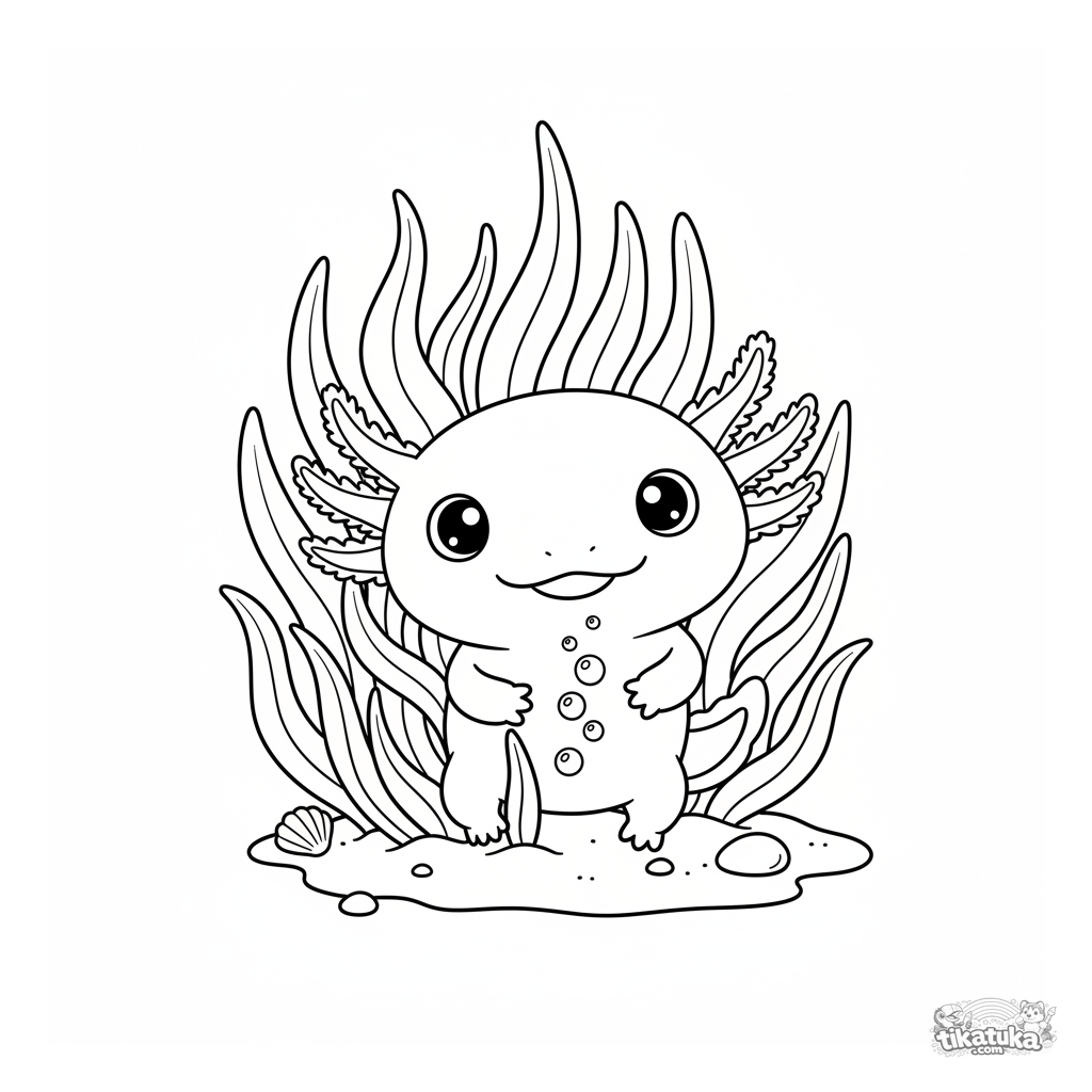 Раскраска для детей 4-6 лет: милый розовый аксолотль с пушистыми жабрами застенчиво выглядывает из-за длинных водорослей, выпуская пузырьки.