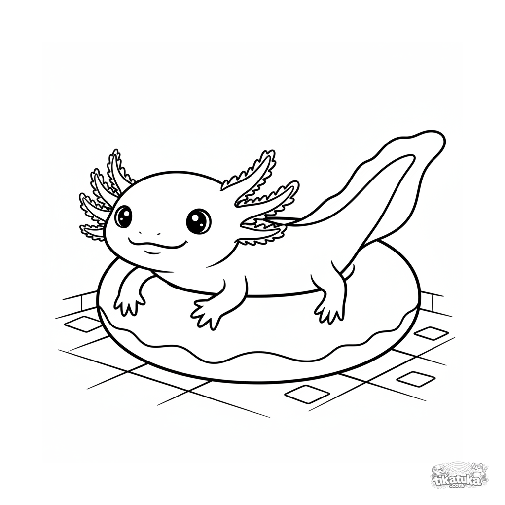 Раскраска с милым аксолотлем, плывущим через надувной круг на дне бассейна. Для детей 4-6 лет. Простые четкие контуры, дружелюбный сюжет.