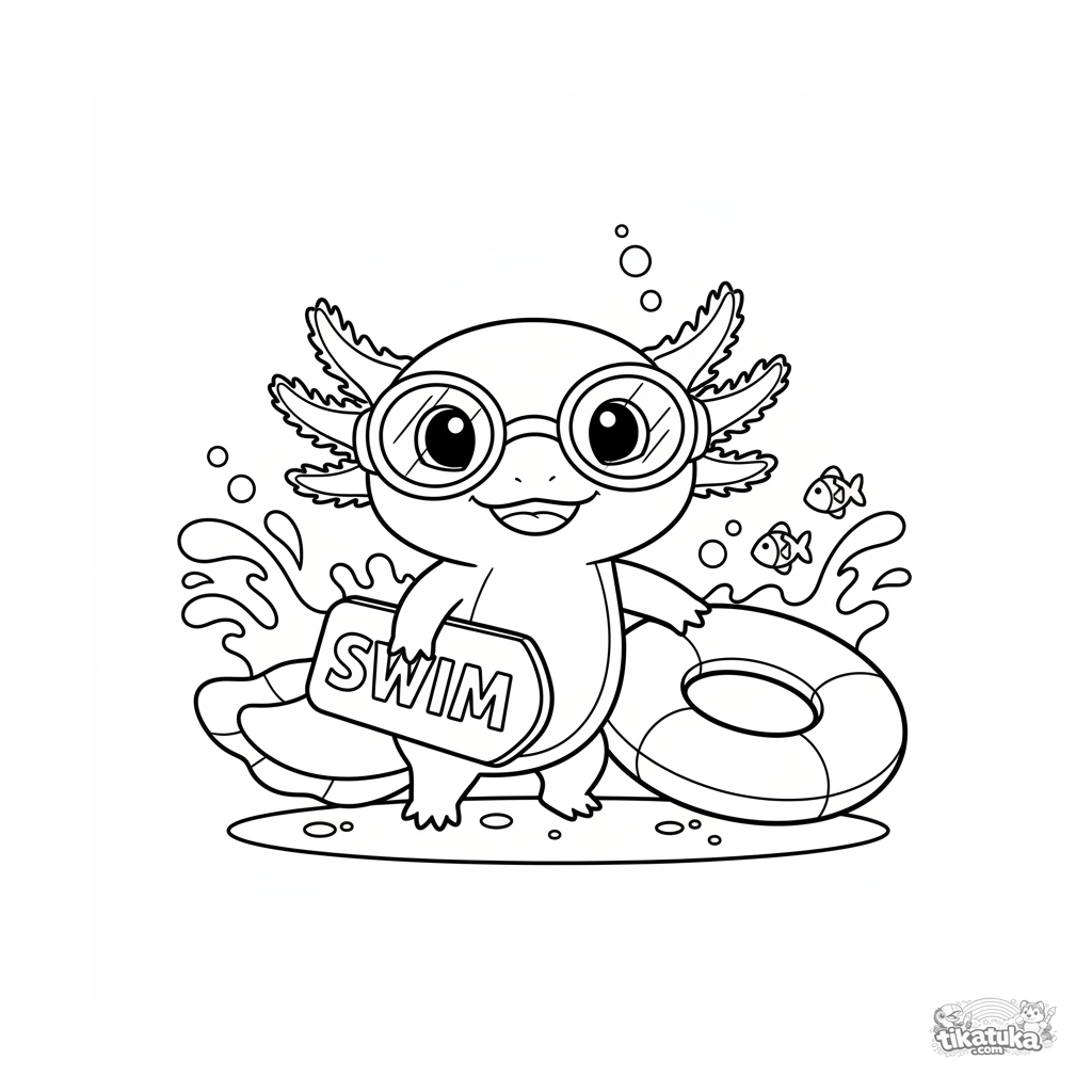 Раскраска для детей 4-6 лет: радостный аксолотль в больших плавательных очках держит доску для плавания, готовясь к уроку на дне бассейна.