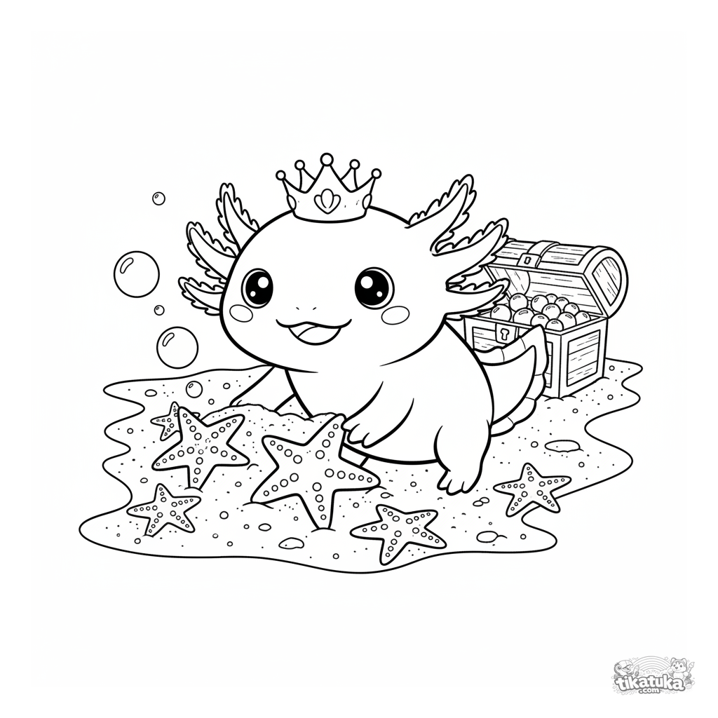 Раскраска для детей 4-6 лет: милый аксолотль в короне из ракушек играет с морскими звёздами на песчаном дне океана, вокруг пузырьки.