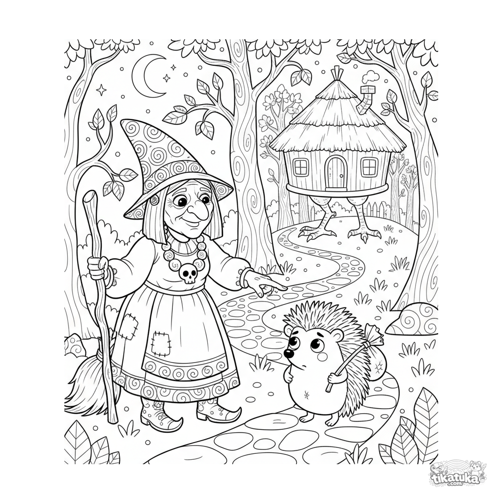 Раскраска по русской сказке для детей 7-12 лет: Баба-Яга в сумерках показывает дорогу заблудившемуся ёжику, а её избушка на курьих ножках виднеется позади. Детализированная сцена.