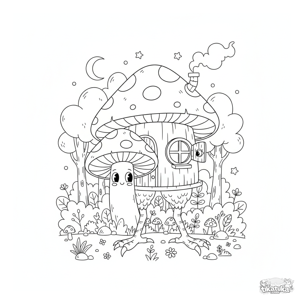 Раскраска для детей 4-6 лет по русской сказке: избушка Бабы-Яги на курьих ножках выглядывает из-за гигантского гриба в лесу. Загадочная и узнаваемая сцена.