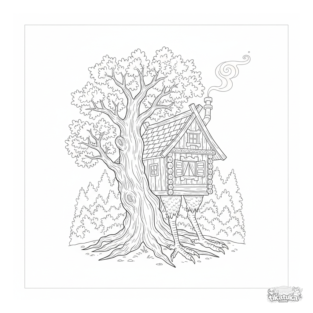 Раскраска для детей 7-12 лет: знаменитая избушка Бабы-Яги на курьих ножках выглядывает из-за старого дуба в тёмном лесу. Детализированная мистическая сцена с дымом из трубы.