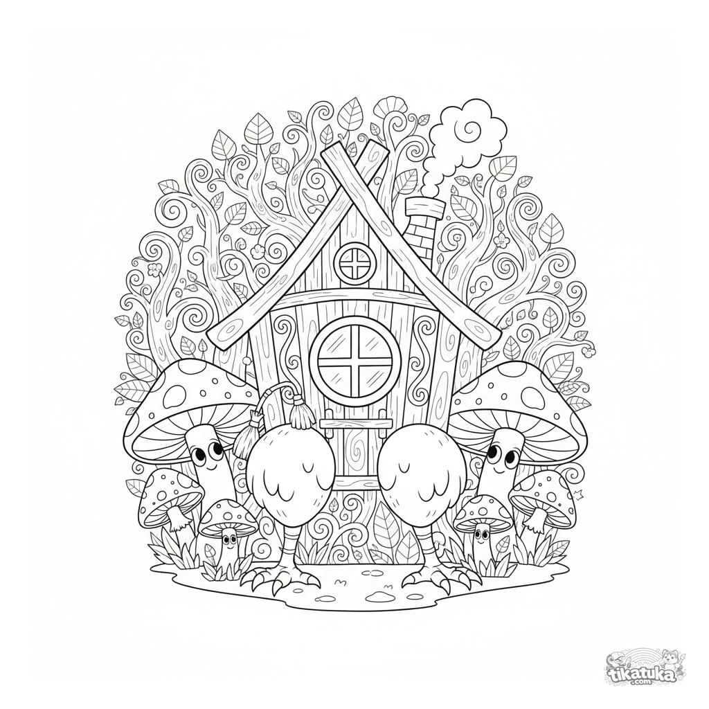Сложная раскраска по сказке: избушка Бабы-Яги на курьих ножках выглядывает из-за гигантских грибов в темном лесу. Для детей 7-12 лет.