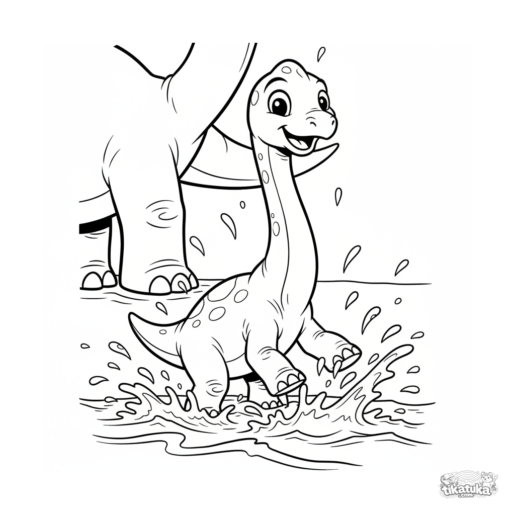 Раскраска для детей 7-9 лет: весёлый детёныш брахиозавра резвится в волнах древнего океана. Динамичная и эмоциональная сцена в мультяшном стиле 90-х.