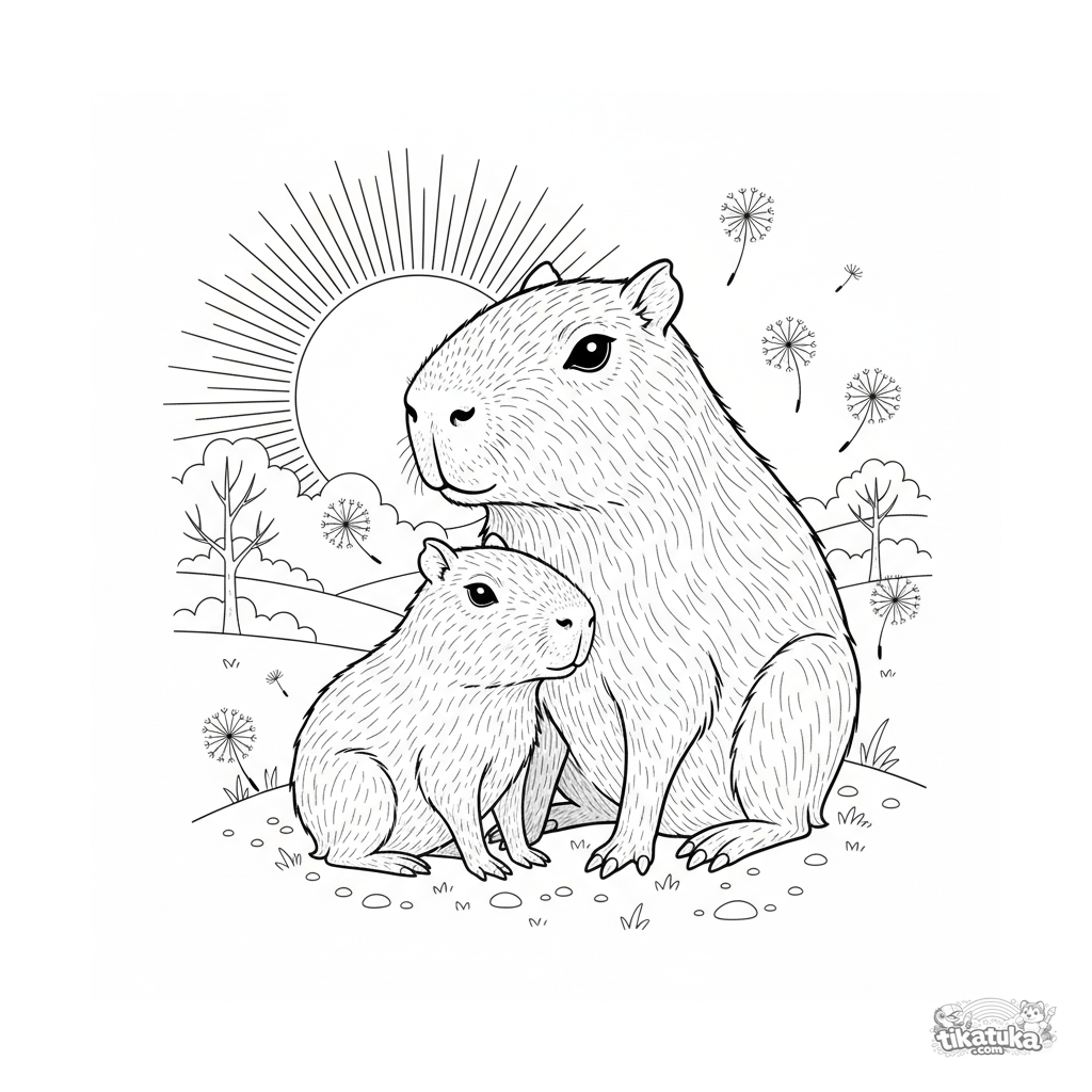 Детальная раскраска для детей 10-12 лет: семья капибар на склоне холма наблюдает за закатом. Реалистичное изображение малыша и родителя в умиротворяющей обстановке.