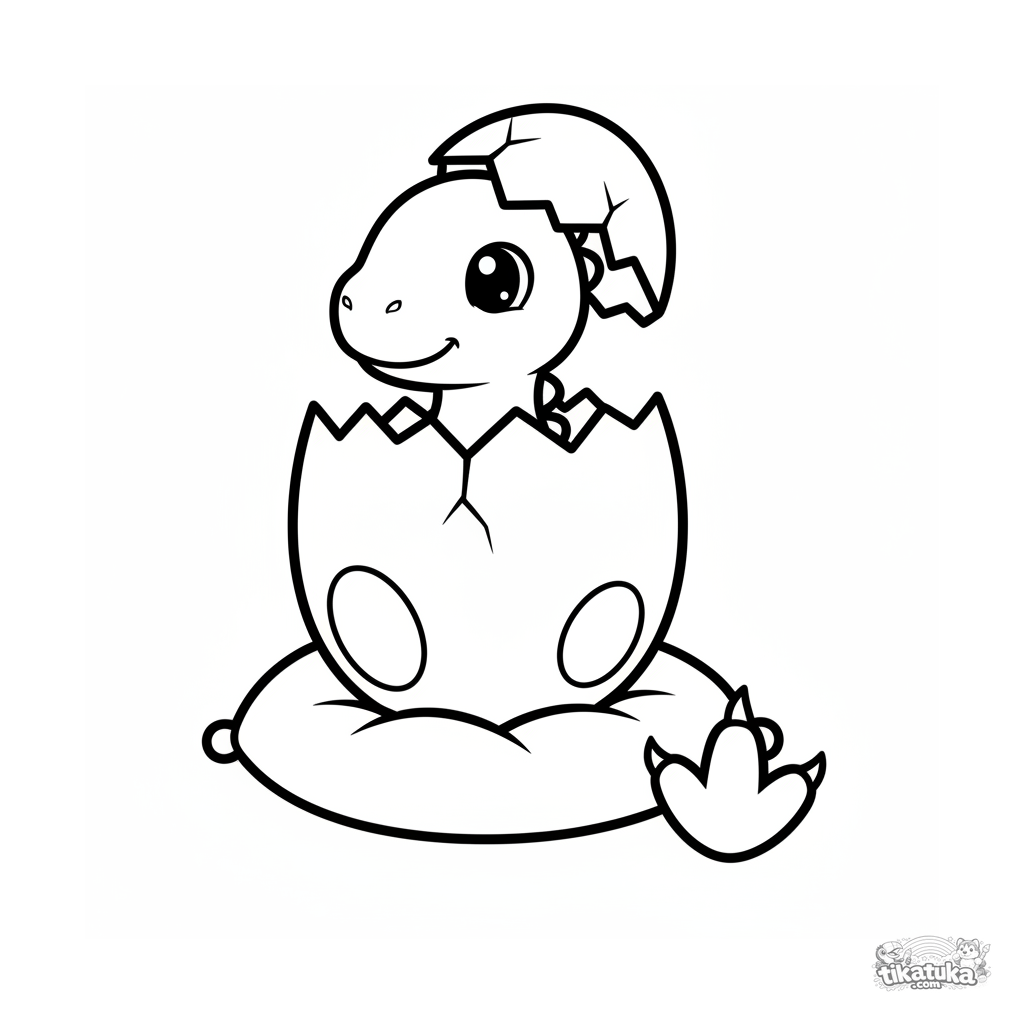 Раскраска для самых маленьких: яйцо динозавра с выглядывающим малышом лежит на подушке. Простые формы, крупный след рядом, широкие поля для раскрашивания.