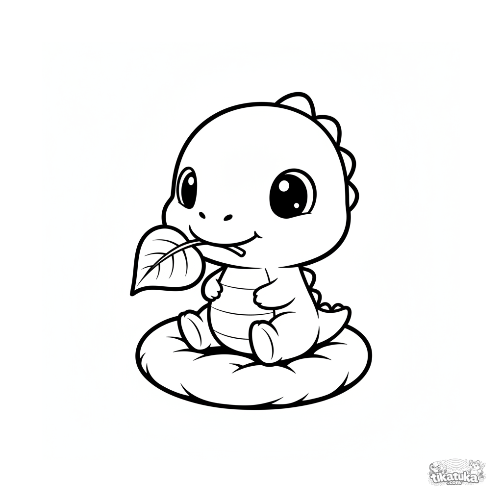 Раскраска для детей 2-3 лет: милый детеныш динозавра с листиком во рту сидит на подушке. Крупная голова, простые формы, широкие чистые поля.