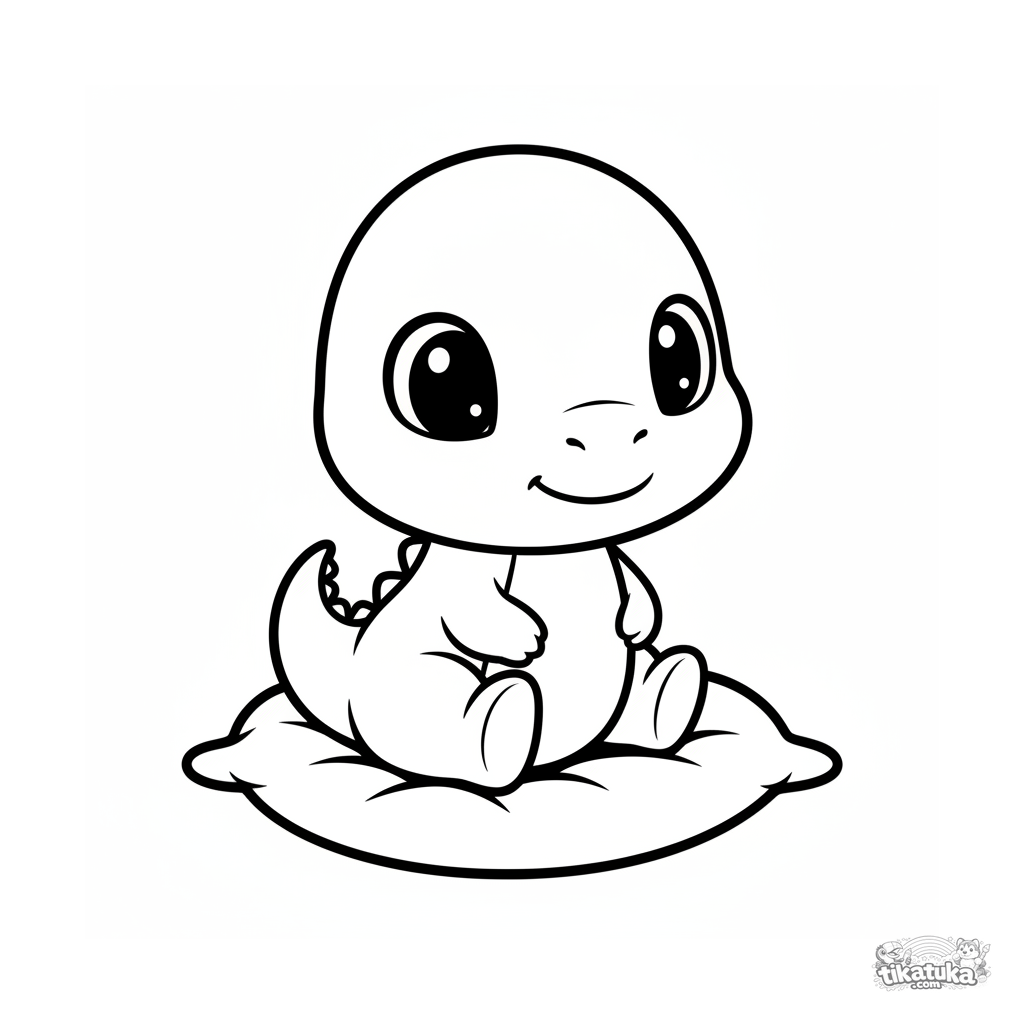 Раскраска для самых маленьких: милый детеныш динозавра в стиле чиби сидит на подушке. Крупная голова, простые формы, без лишних деталей.