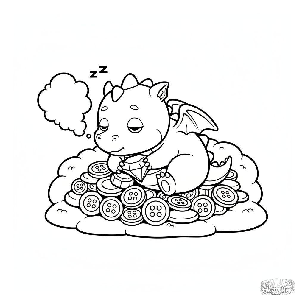 Простая раскраска для малышей 2-3 лет: милый дракончик спит на куче блестящих безделушек. Крупные четкие формы, мало деталей, идеально для первых карандашей.