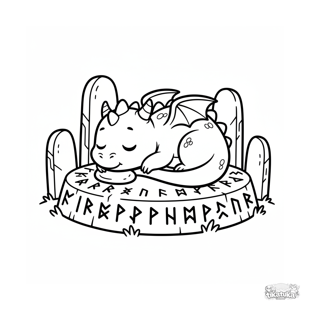 Раскраска для малышей: маленький дракончик сладко спит на древнем камне с рунами. Простые крупные формы, идеально для первых карандашей.