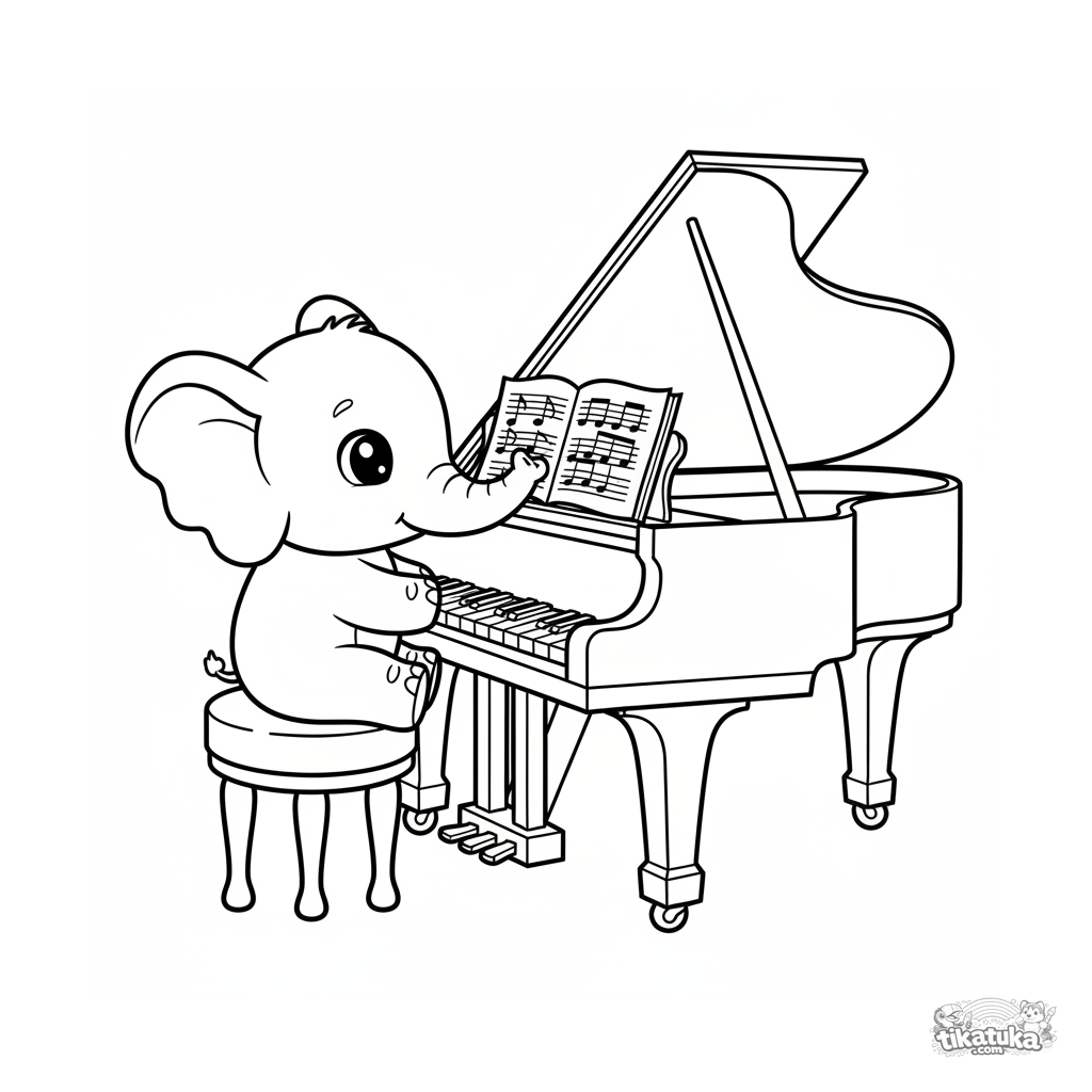 Простая раскраска для малышей 2-3 лет: милый слонёнок исследует огромный рояль на сцене. Огромные простые формы, толстые контуры, одна крупная деталь.