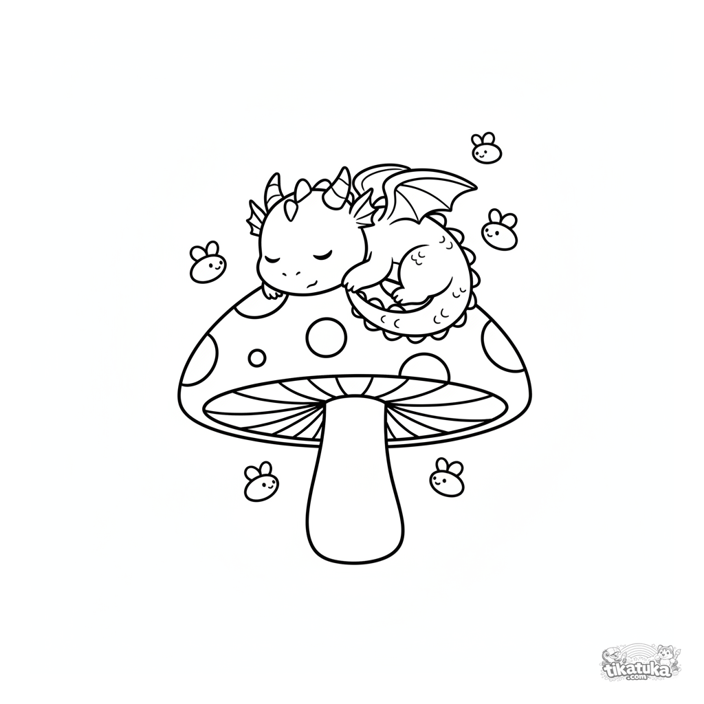 Раскраска для малышей 2-3 лет: крошечный дракончик спит на шляпке гриба. Очень простые крупные формы, мало деталей, идеально для первых карандашей.