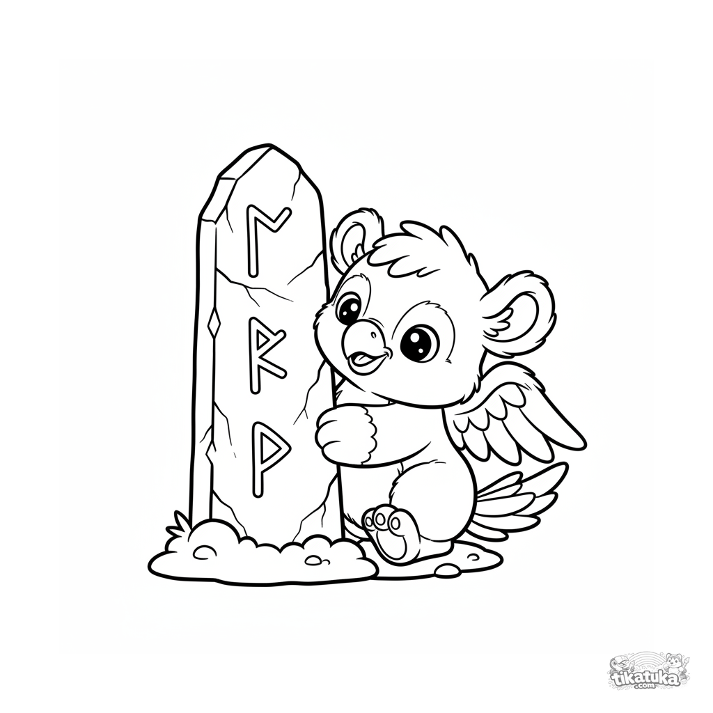 Раскраска для малышей: пушистый грифончик смотрит из-за древнего монолита с рунами. Простые формы, широкие поля для раскрашивания.