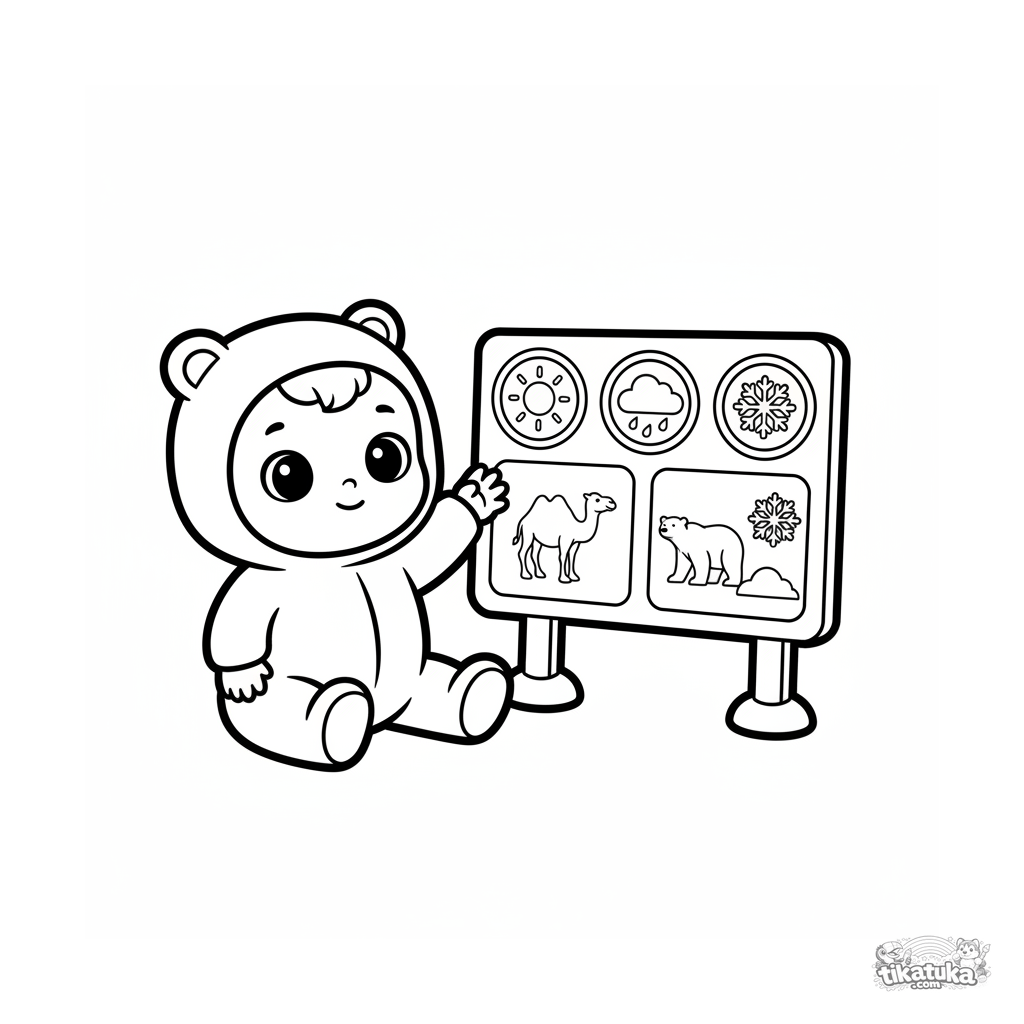 Раскраска для малышей 2-3 года: ребенок сидит и изучает большие символы погоды на низкой табличке в зоопарке, связанные с климатом животных. Простая сцена для первого знакомства с погодой.