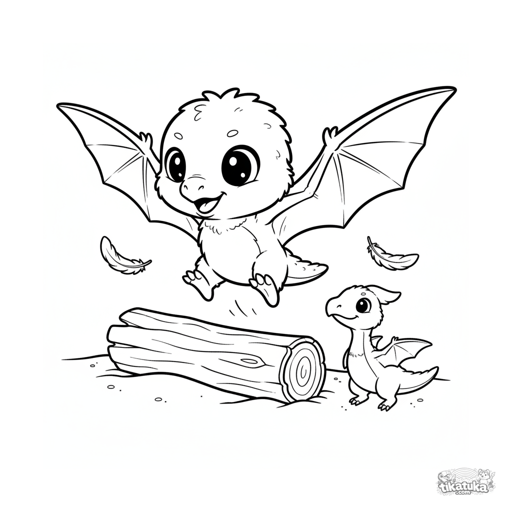 Простая раскраска для малышей 2-3 лет: пушистый детёныш птерозавра впервые взлетает с бревна на древнем пляже. Крупные простые формы идеальны для первых карандашей.