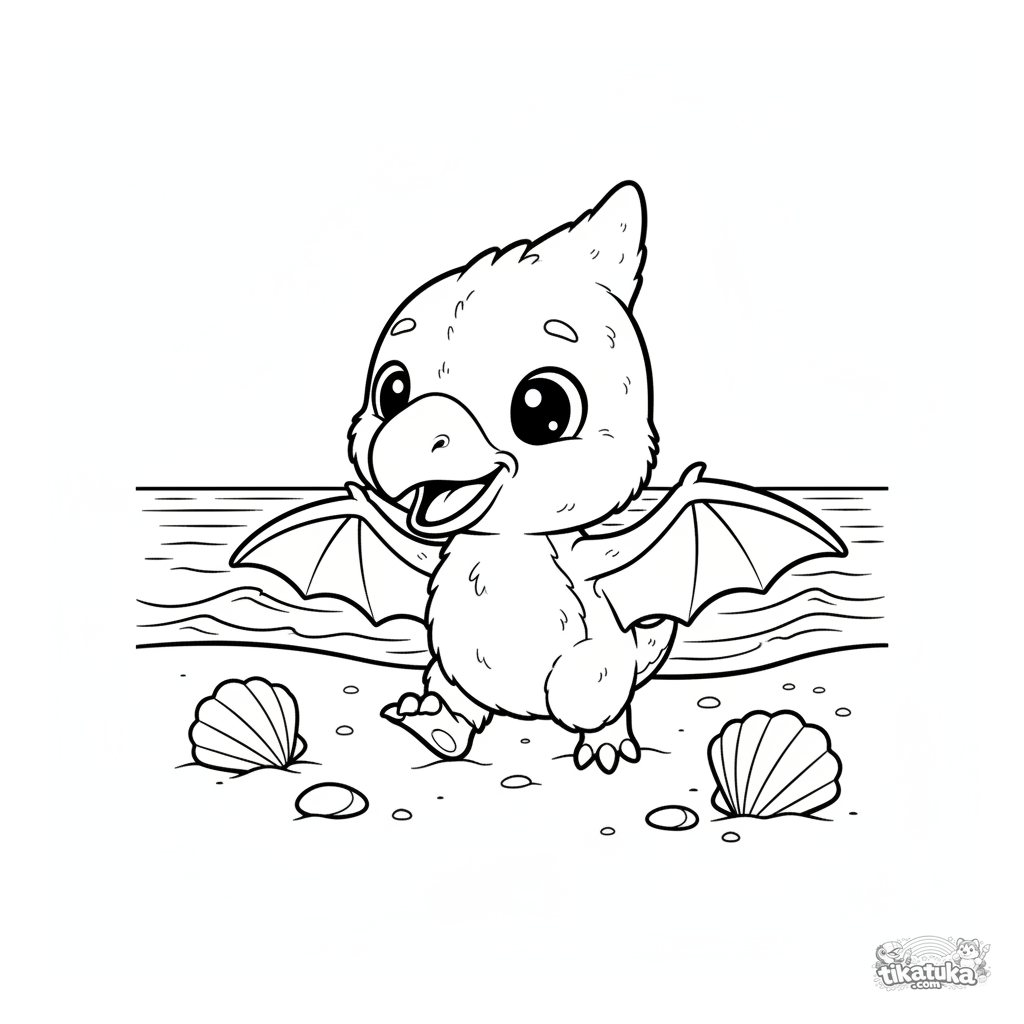 Раскраска для малышей 2-3 года: пушистый детёныш птерозавра делает первые шаги по песку древнего пляжа. Простые формы, крупные детали.
