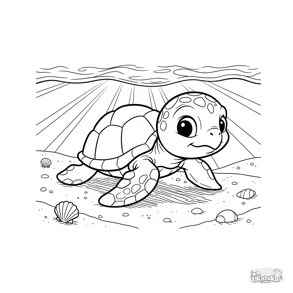 Раскраска для детей 7-9 лет: детёныш морской черепахи ползёт по песку к солнечной поверхности на мелководье. Выразительная поза, умеренная детализация.