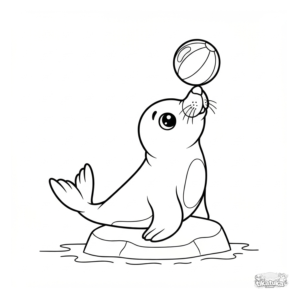 Раскраска для детей 3-5 лет: маленький тюлень балансирует шариком на носу. Забавный сюжет с минимальным фоном для лёгкого раскрашивания.