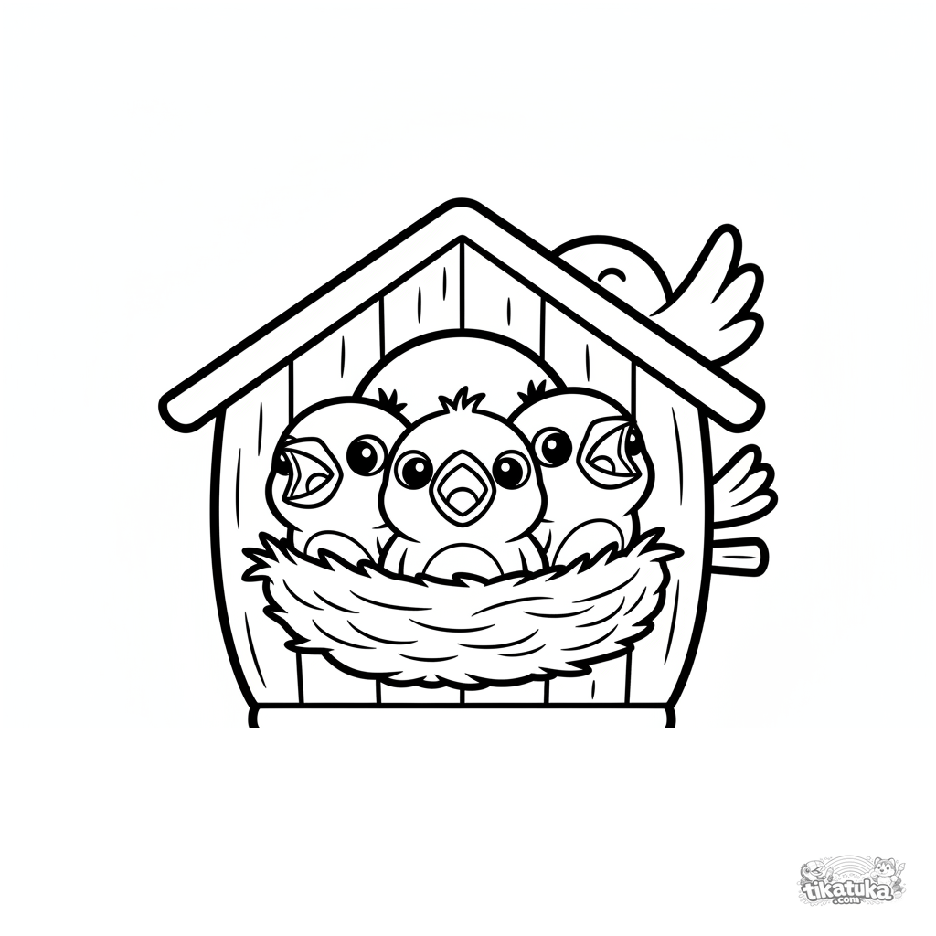 Раскраска для малышей 2-3 года: три пушистых птенца воробья в уютном гнезде внутри деревянного скворечника. Простые крупные формы, мало деталей.