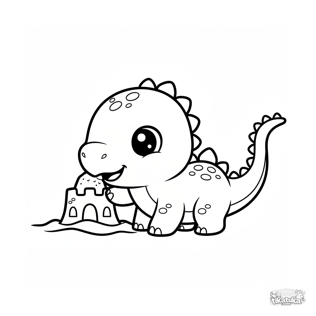 Раскраска для малышей 2-3 лет: детёныш стегозавра строит замок из песка на берегу древнего океана. Простая раскраска с крупными формами.