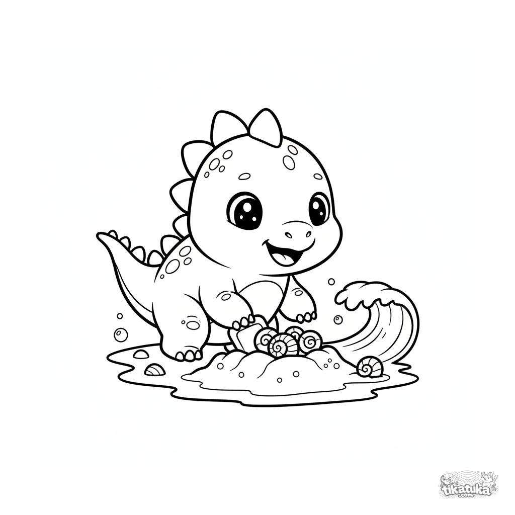 Простая раскраска для малышей 2-3 лет: милый детёныш стегозавра радостно копает ямку в песке на берегу древнего океана, находя ракушки. Крупные формы, толстые контуры.