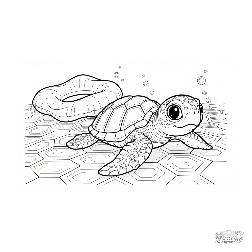 Раскраска для детей 7-9 лет: детеныш черепахи исследует узорчатую плитку на дне бассейна рядом со сдутым кругом. Умеренная детализация, образовательная тема исследования.