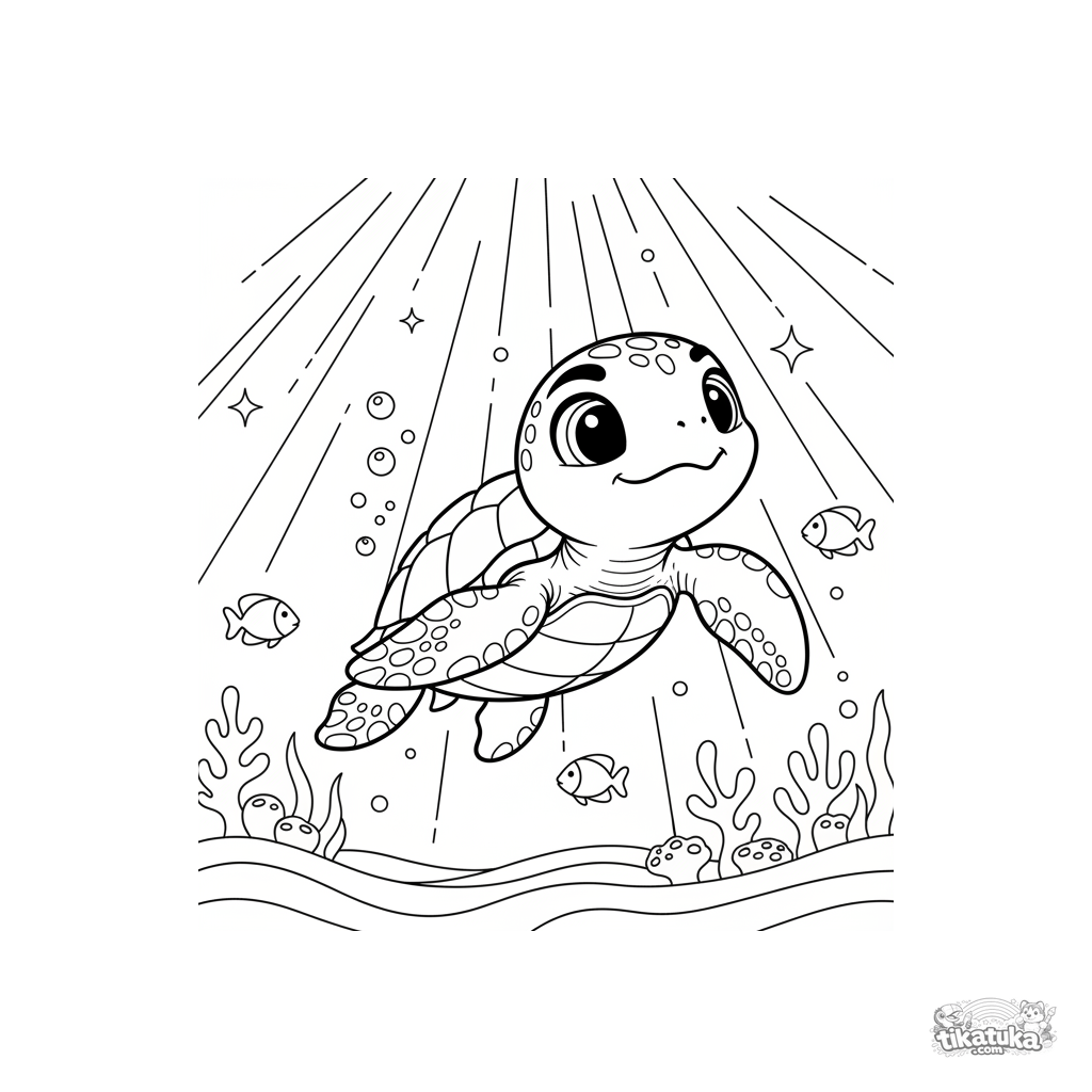 Раскраска для детей 7-9 лет: маленькая черепашка, только что вылупившись, плывёт к поверхности в столбе солнечного света на мелководье.