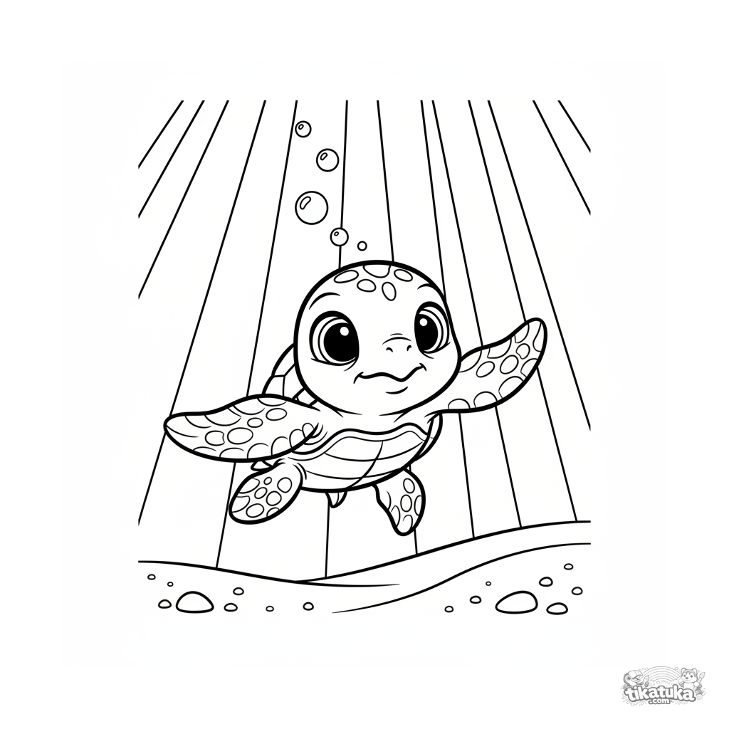Раскраска с детёнышем морской черепахи, плывущим к поверхности в солнечных лучах на мелководье. Для детей 7-9 лет, с выразительными деталями и широкими полями.
