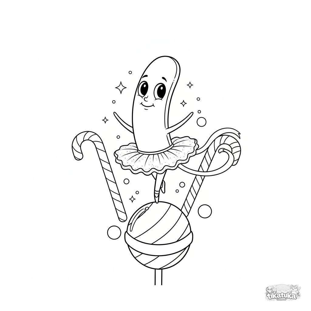 Раскраска для детей 7-9 лет в стиле Дисней: изящная бацилла-балерина в пачке из сахара танцует на кончике леденца. Плавные линии и красивая сцена.
