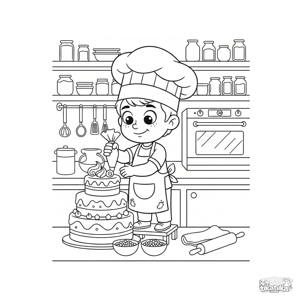 Раскраска с мальчиком-поваром, украшающим многоярусный торт в пекарне. Для детей 4-6 лет. Весёлая сцена, связанная с едой.