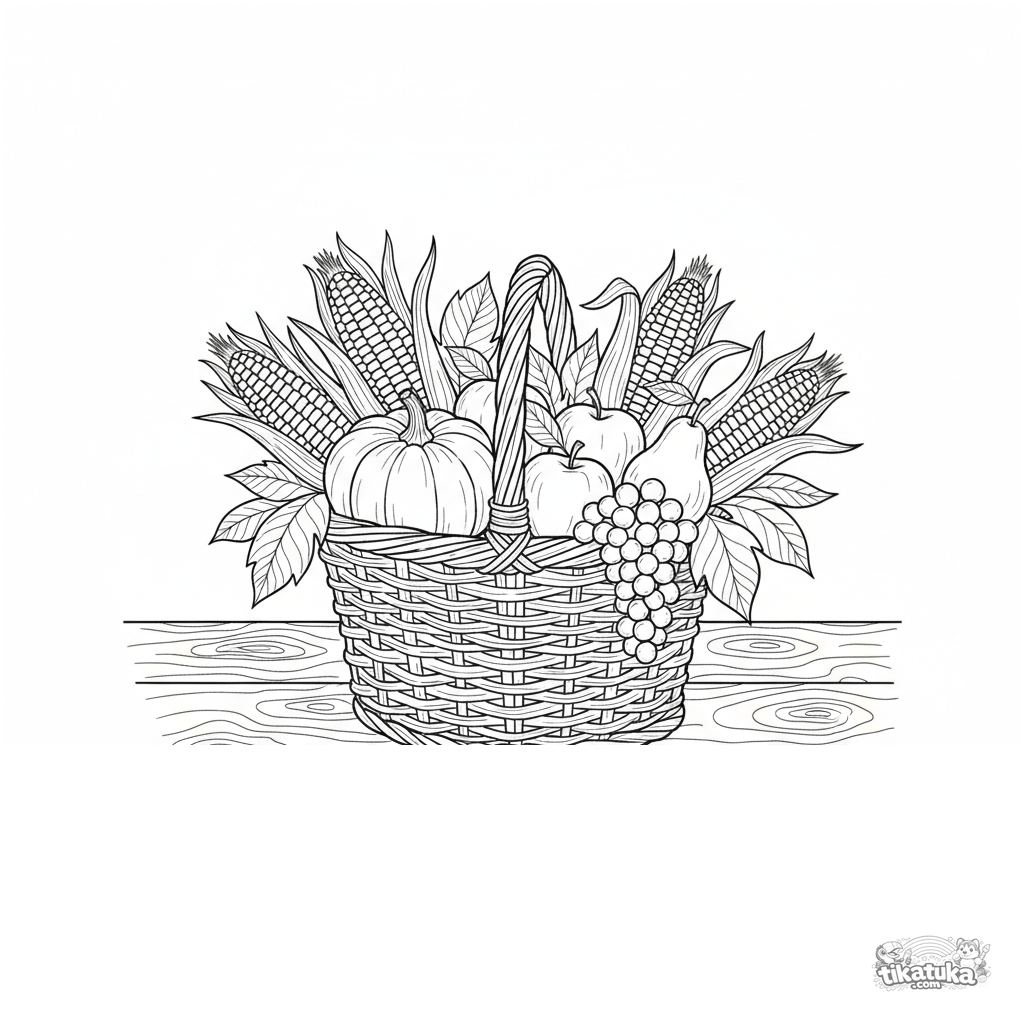 Детальная раскраска для детей 10-12 лет: корзина, полная осеннего урожая. Реалистичный стиль акварельного наброска, уютный натюрморт на деревянном столе.