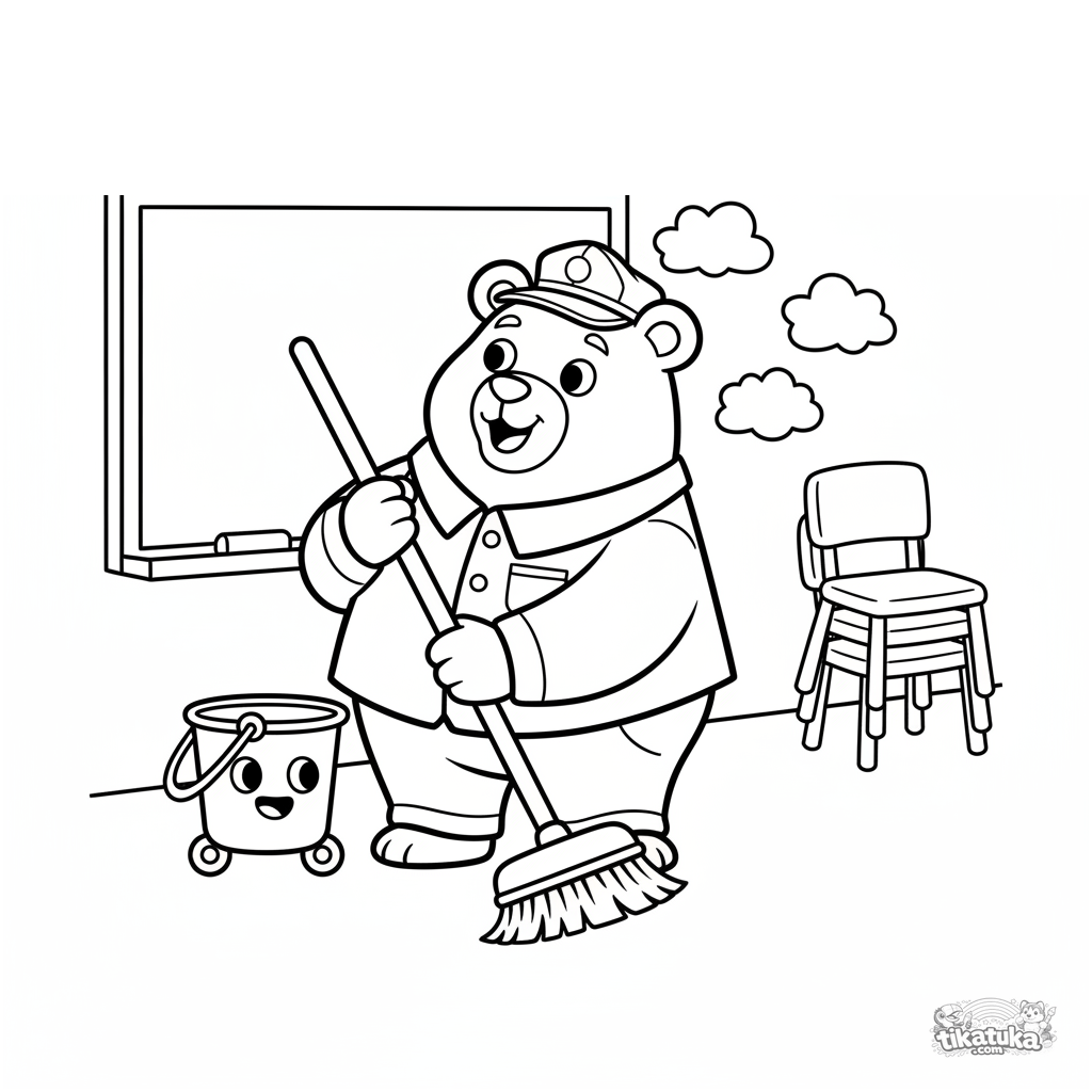 Раскраска для малышей 2-3 года: добрый медведь-уборщик в форме весело подметает пол в школьном классе у доски с метлой и ведром.
