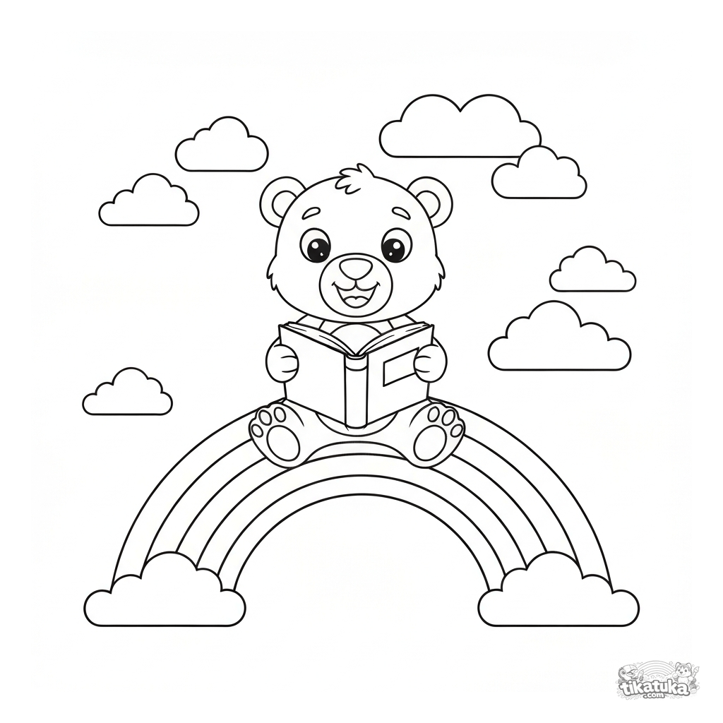 Добрый медвежонок удобно устроился на разноцветной радуге и читает интересную книгу. Прекрасная сцена для спокойного раскрашивания.