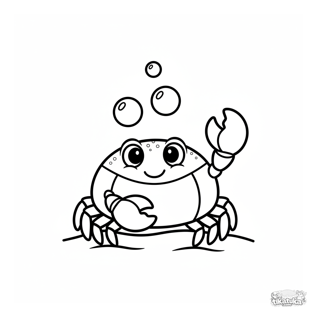 Раскраска для малышей 2-3 года: большой дружелюбный крабик сидит на песке на мелководье. Очень простые формы, толстые контуры, много свободного места для раскрашивания.