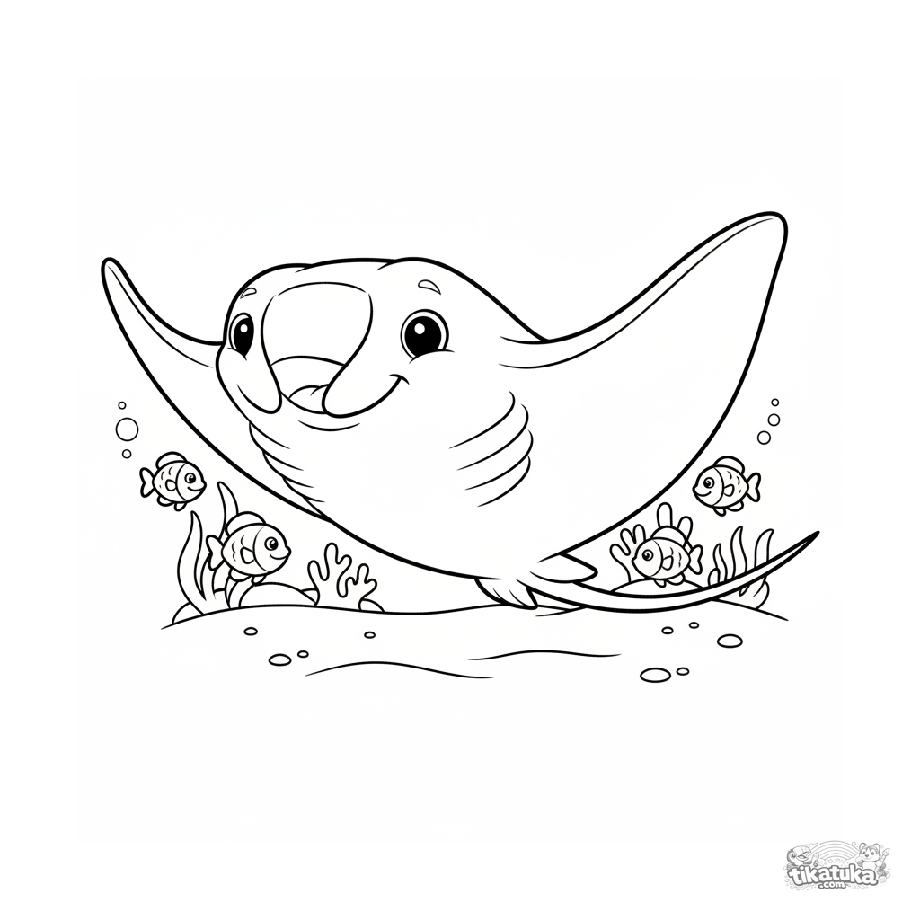 Раскраска для детей 7-9 лет: улыбающийся скат манта плавает над песчаным дном на солнечном мелководье. Классический диснеевский стиль, плавные линии.