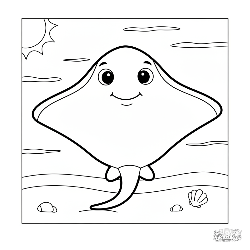 Простая раскраска с большим дружелюбным скатом, лежащим на солнечном песке на мелководье. Для малышей 2-3 лет, огромные простые формы.