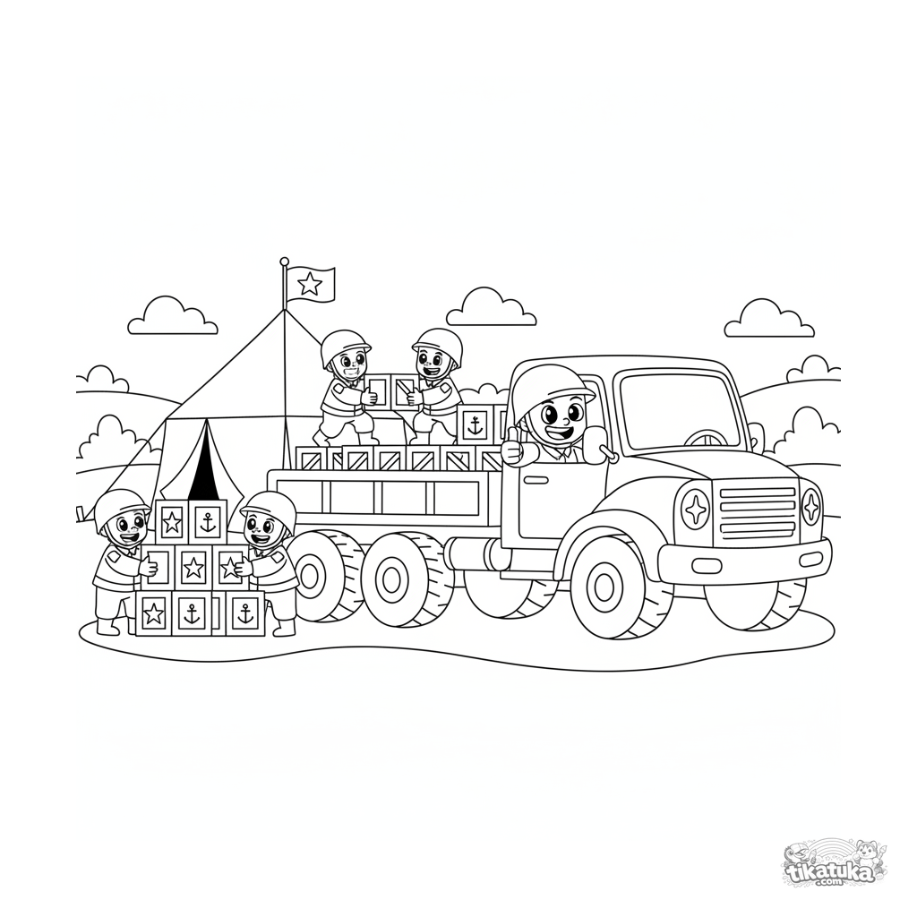 Раскраска для детей 7-9 лет: большой армейский грузовик разгружает ящики с припасами возле палатки полевого штаба. Солдаты работают, водитель показывает палец вверх.