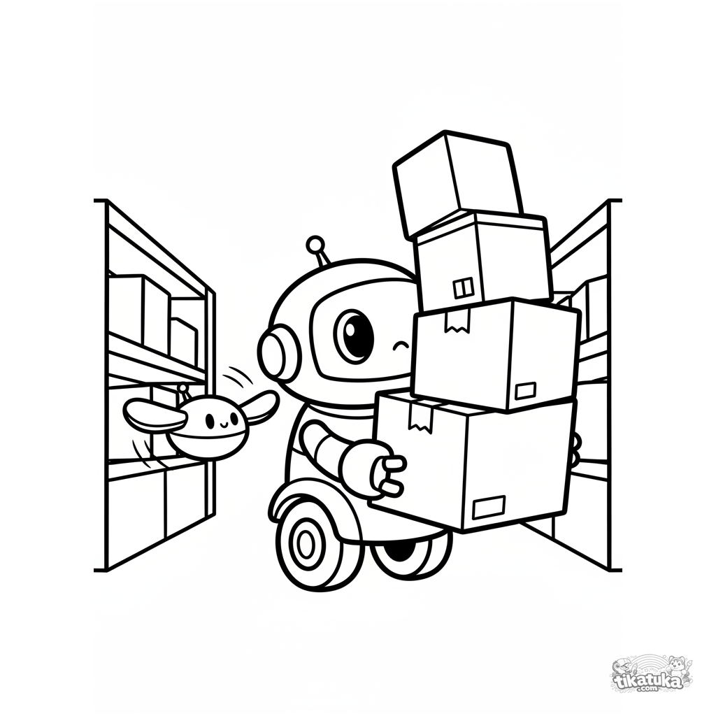 Простая раскраска для малышей 2-3 года: весёлый круглый робот на одном большом колесе аккуратно везёт высокую стопку коробок по складу, мимо пролетает дрон.