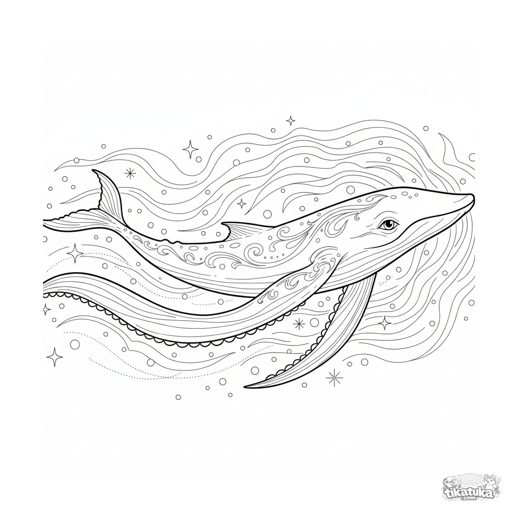 Раскраска для детей 10-12 лет: фантастический светящийся кит плывет сквозь туманность и звезды. Детализированный рисунок в стиле научного справочника.