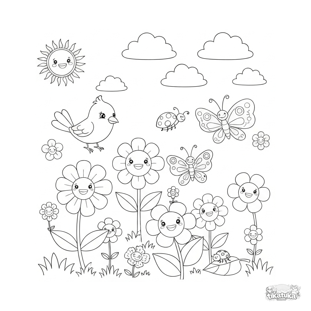 Раскрасьте этот дружелюбный сад с цветами и бабочками! Идеально для творческого времяпрепровождения с детьми.