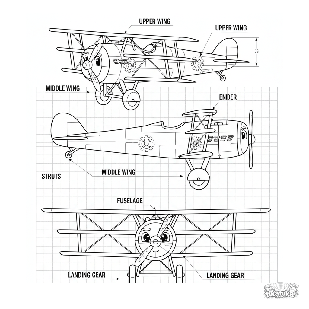 Образовательная раскраска в виде инженерного чертежа триплана времен Первой мировой войны. Стилизованная схема для детей 10-12 лет, интересующихся техникой и историей.