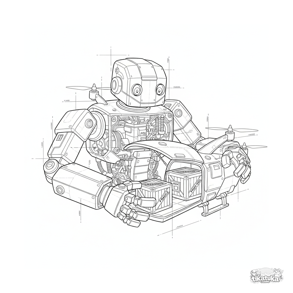 Сложная раскраска для 10-12 лет: робот с прозрачным корпусом, как технический чертёж, разгружает ящики из грузового отсека большого летающего дрона на складе.